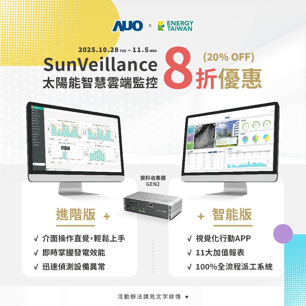 活動商品:SunVeillance太陽能智慧雲端監控 好評如潮!加碼延長!8折優惠 活動辦法: 活動優惠價,活動結束即恢復原價 注意事項 ※各項優惠恕不併用。 ※本活動如有未盡事宜,友達能源商城得隨時補充、修正或變更,且以商城官網最新公告為主。 加入友達能源商城官方LINE好友,讓您掌握最新消息,享受專屬優惠。 商城官方LINE:@auoenergy